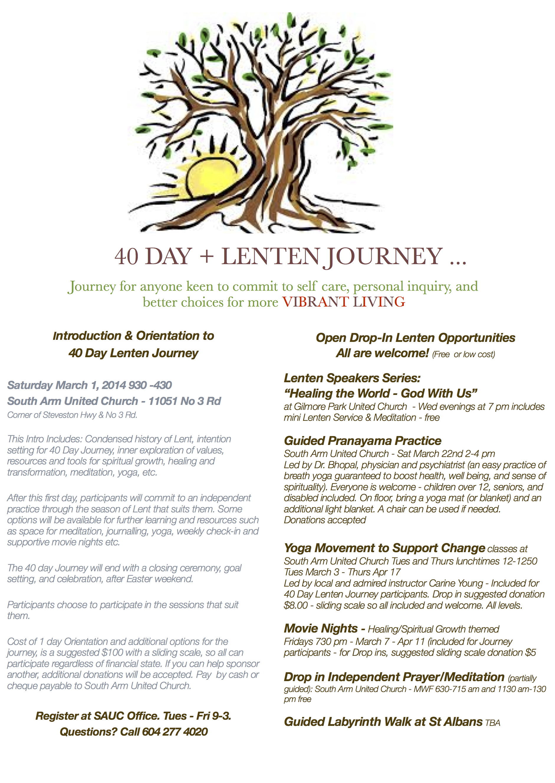 I’m honoured to be leading yoga at SAUC on Tuesdays and Thursdays at noon during their Lenten 40 Day Journey. (Check out the poster below and join in to discover YOU!)