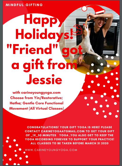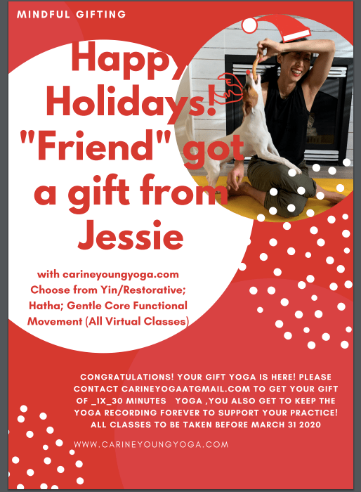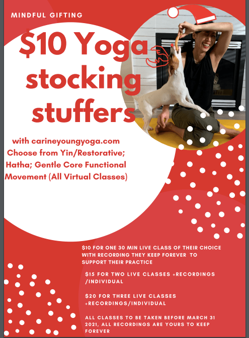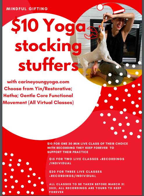 “Carine’s yoga classes are medicine for both my body and my soul. Her classes have made navigating our current global pandemic so much easier, keeping me grounded and consistently providing moments of deep self care infused with her every day wisdom. I am so excited she is offering stocking stuffers so I can gift the many people I love with these gems – like a mini oasis in the midst of chaos. I can’t think of a better gift for the family, friends, teachers, co-workers and clients I care about.” ~ Jessie Sutherland, Director of Intercultural Strategies